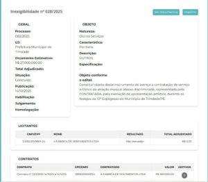 O primeiro registro refere-se à Inelegibilidade nº 028/2025, datada de 14 de outubro de 2025, para contratação de serviço artístico (show), tendo como contratada a empresa A Fábrica de Sentimentos LTDA. Nesse processo, consta valor estimado de R$ 27.000.000,00, enquanto o valor real contratado foi de R$ 300.000,00.